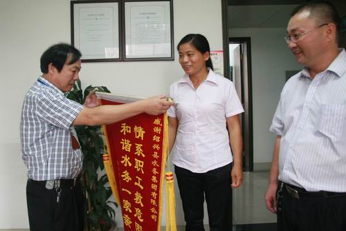 8月17日,家庭遭受火災的供水公司分公司職工莫煜君在分公司負責人及村支書的陪同下來到集團公司送上一面“情系職工救危困,和諧水務一家親”錦旗,感謝集團工會對其的幫助。