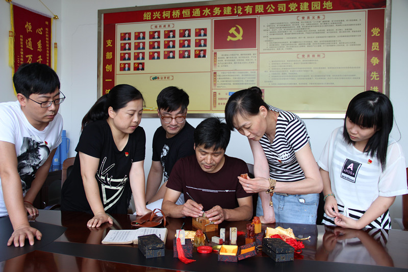 為進一步推進“兩學一做”學習教育,日前,恒通水務建設公司黨支部組織黨員以“黨在人民心中”為主題進行書法、篆刻創作,廣泛地吸引了黨員干部參與。圖為公司職工金偉勇在向黨員們傳授篆刻的竅門。