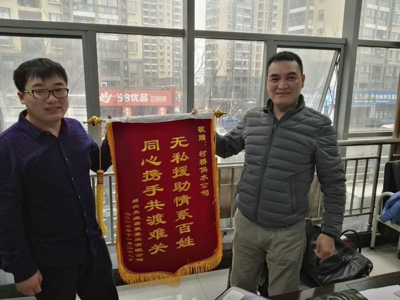 125日,二次供水分公司收到紹興元壟鑫宸置業有限公司大都會項目負責人專程送來的錦旗,對分公司工作人員為大都會樣板房場外給水管道建設提供的真情服務表示贊賞和感謝。