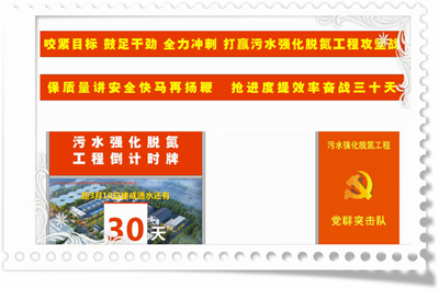 目前,在污水強化脫氮工程現(xiàn)場明顯位置,已樹立工程沖刺倒計時牌。公司要求,各級領(lǐng)導(dǎo)干部人員必須清醒認識到形勢嚴峻,要在最后1個月的時間里拿出更大的干勁全面沖刺,確保工程建設(shè)任務(wù)的按期完成。同時,公司黨支部錢書記也特別強調(diào),要充分發(fā)揚黨員干部先鋒模范帶頭作用,使廣大黨員平常時候看得出來、關(guān)鍵時刻站得出來、危急關(guān)頭豁得出去,要將把黨的政治優(yōu)勢轉(zhuǎn)化為項目推進優(yōu)勢,把黨建力量凝聚為奮斗合力,確保工程順利建成通水。